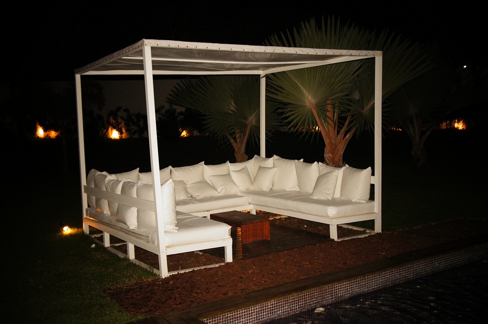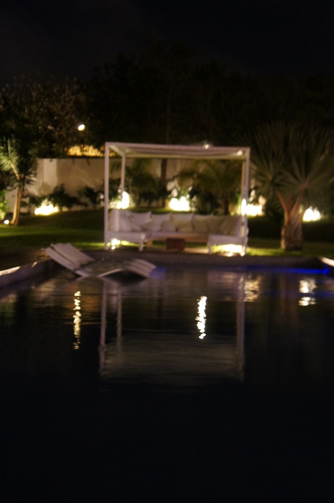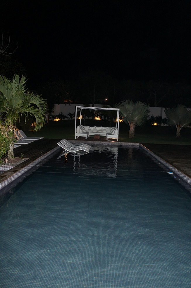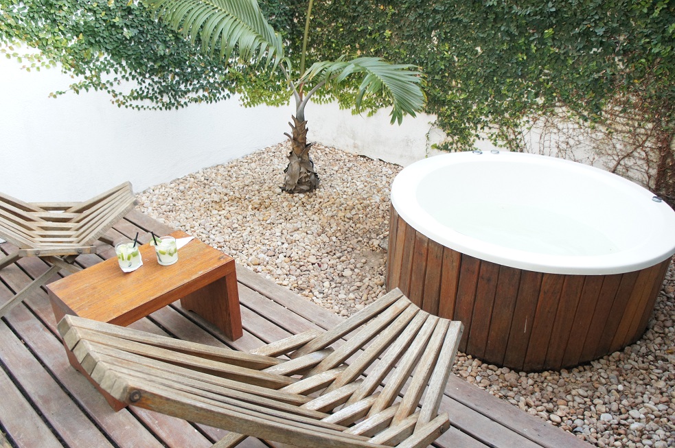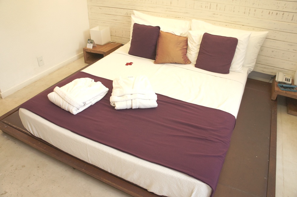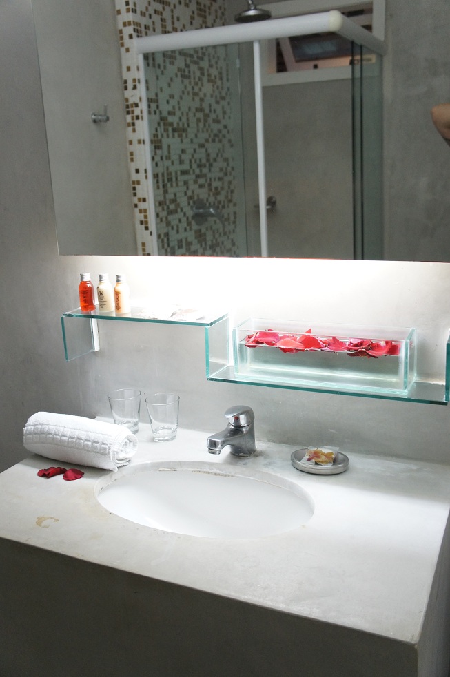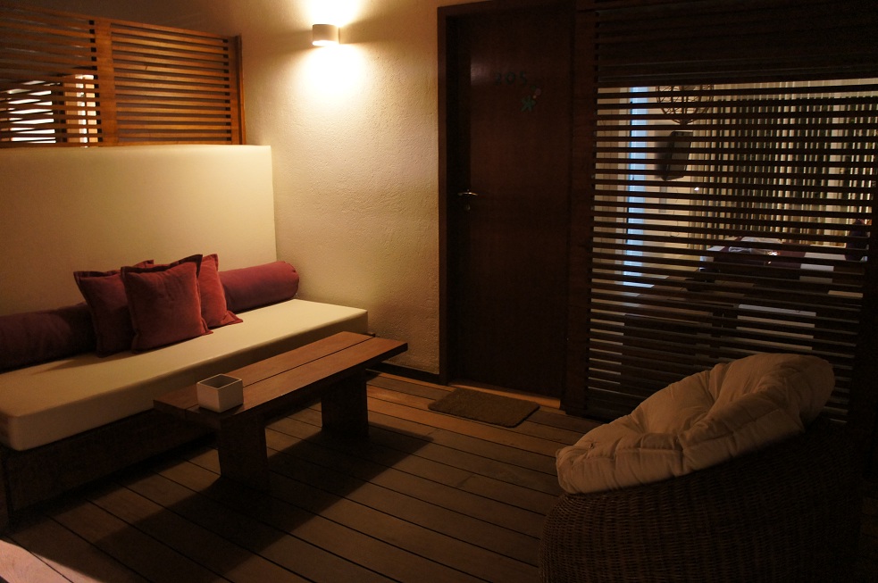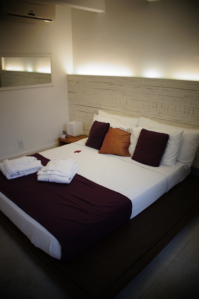 Meu quarto era o duplo superior com ofurô, tinha na entrada fora do quarto uma varanda de frente pro jardim e pra todos os outros quartos com uma mesinha e sofá, o quarto era com TV LCD, armário, cofre, frigobar que não tinha o menu com os preços dos itens, ar condicionado split, banheiro com o box extremamente pequeno, sinceramente queria saber porque tanta economia pra fazer um box de criança, e uma varanda privativa com ofurô, pétalas sobre a cama e no banheiro e roupões. Fomos recepcionados com um welcome drink, pedimos 2 caipirinhas.